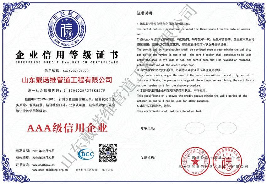 管道非開挖修復工程服務企業資質證書